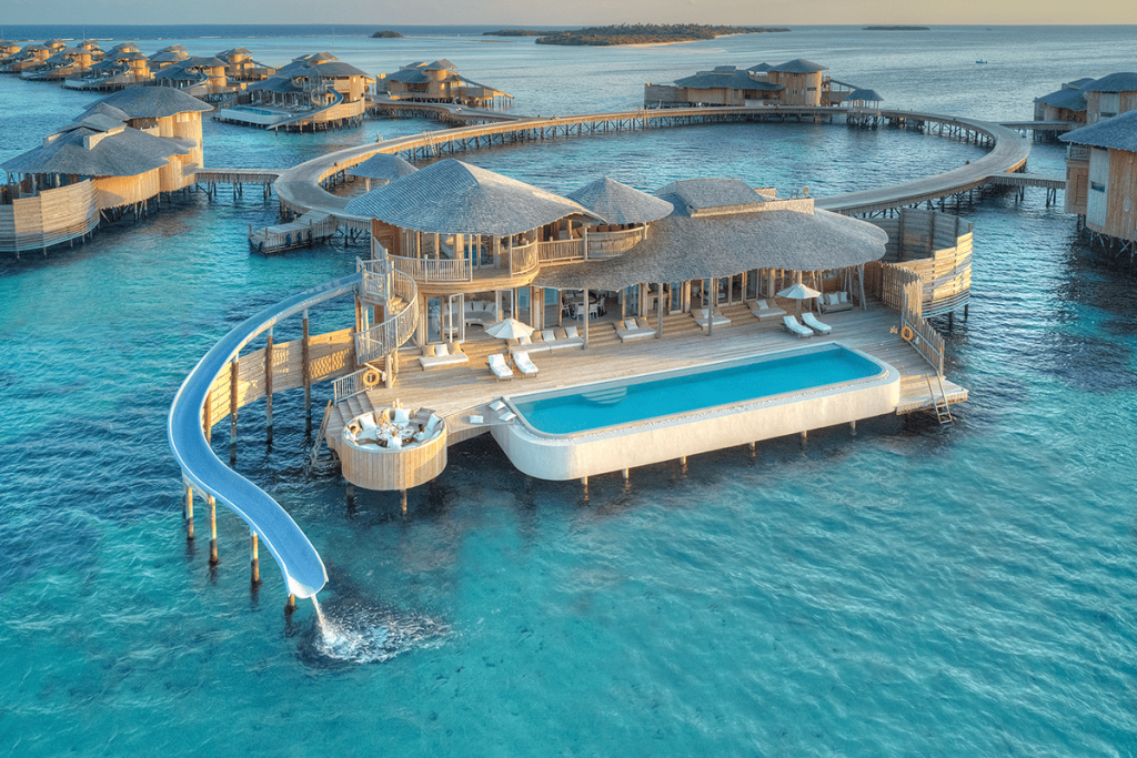 • The resort features some of the Maldives’ largest overwater and beach villas. Each has private pools. The villas are spread across a peaceful lagoon. Many villas include retractable roofs for stargazing and water slides leading into the lagoon.