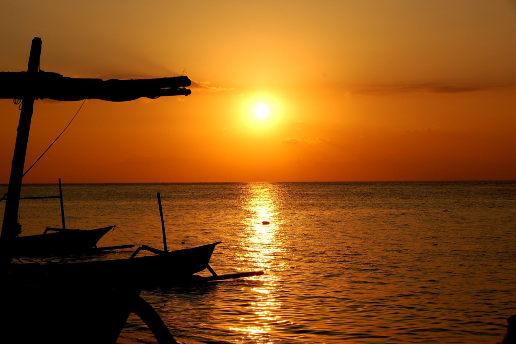 - White sand and calm water frame the sunrise. The beach gets a more polished feel than Bali’s surf beaches. You can enjoy the sunrise right at the shoreline.
