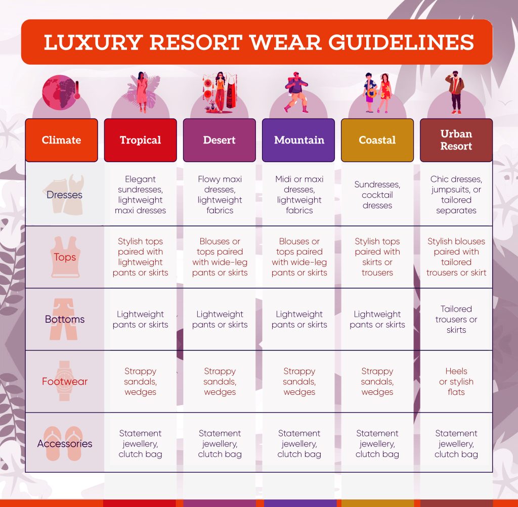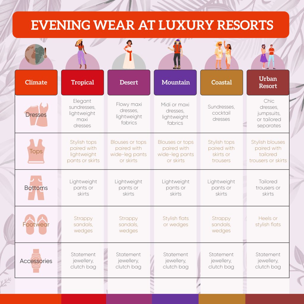 For evening wear at luxury resorts, the overall concepts remain consistent across different climates. There may be slight variations in fabric choices and footwear. Check out the below tabulation.