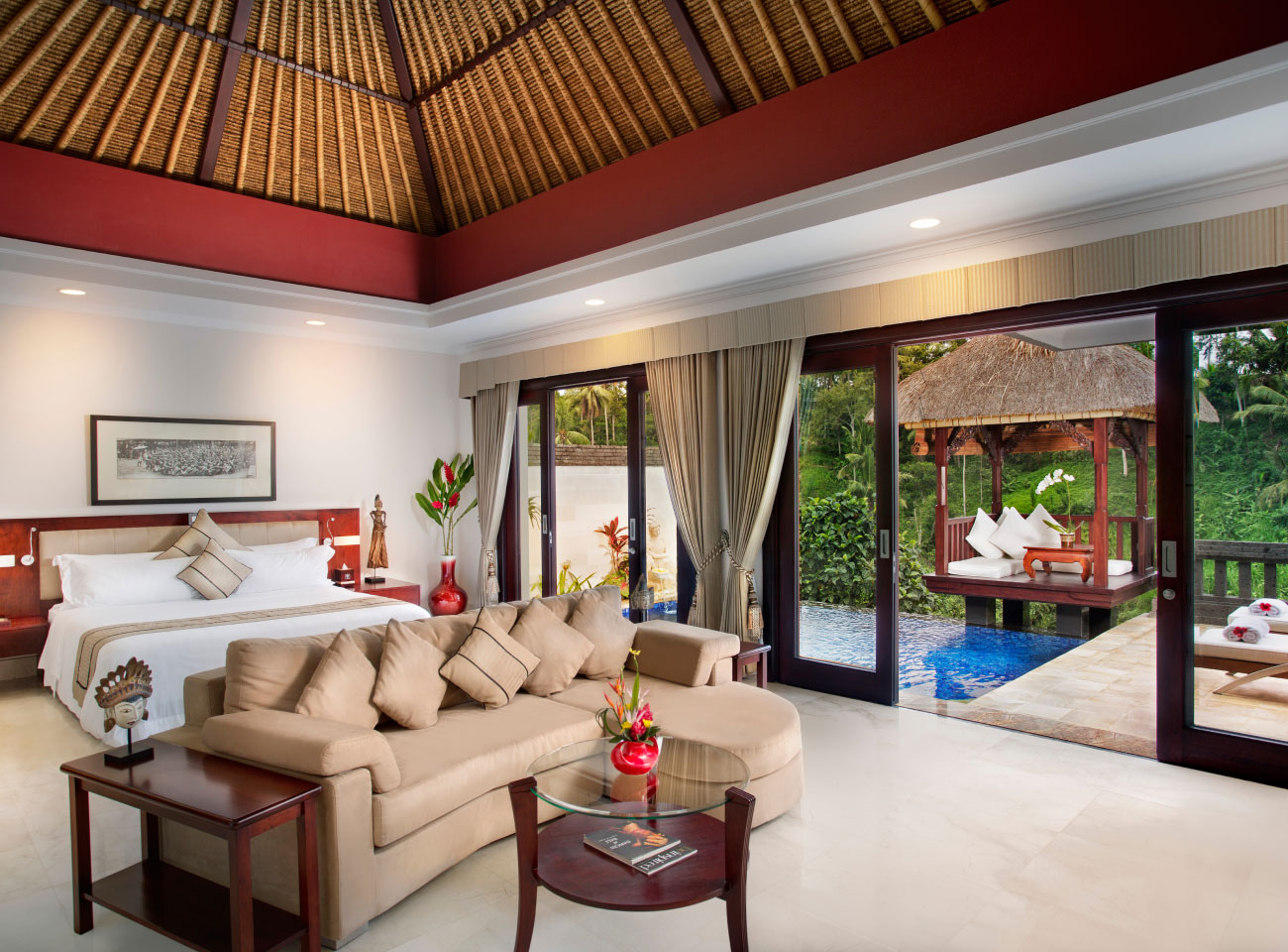 - Modern yet authentic Balinese design; think vaulted thatched roofs, stone floors, dark wood furnishings and four-poster beds.