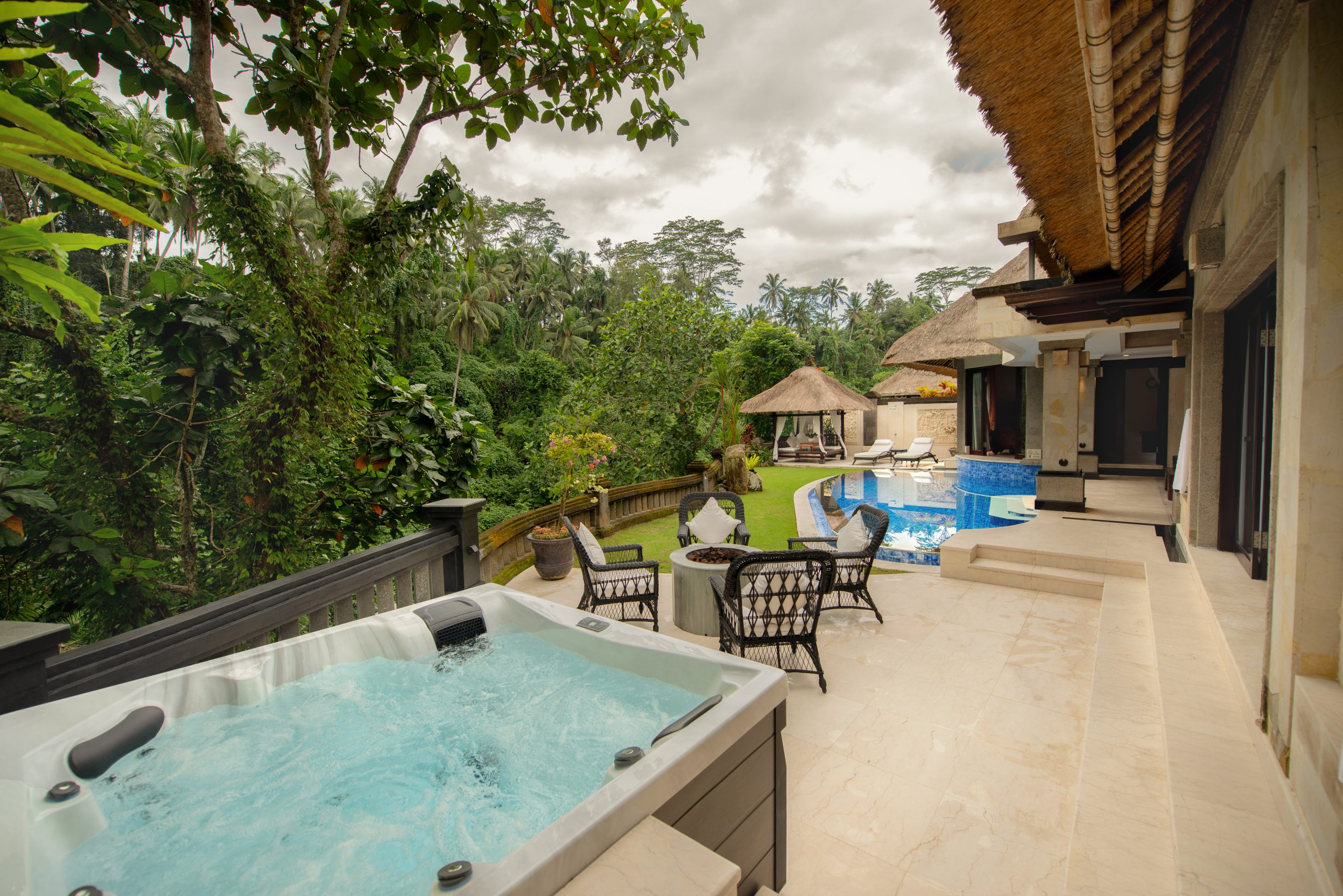 The crowning jewel of the Viceroy Bali collection, the Viceroy family Villa with private pool is one of the top family villas in Bali. This 2-bedroom expansive villa located in Ubud has two master bedrooms with lavish marble ensuites, separated by a common semi-outdoor living and dining area adorned by a double tiered thatched roof. Both bedrooms look out to the 15-meter (4m wide by 12m long) heated pool and grass gardens; with the lush valley as a perfect backdrop.